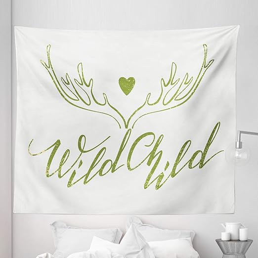 Amazon Com Lunarable Wild Child Tapestry King Size Cursive Hand Drawn Antlers And Heart With Inspirational Words Image Wall Hanging Bedspread Bed Cover Wall Decor 104 X 88 Olive Green And White Home