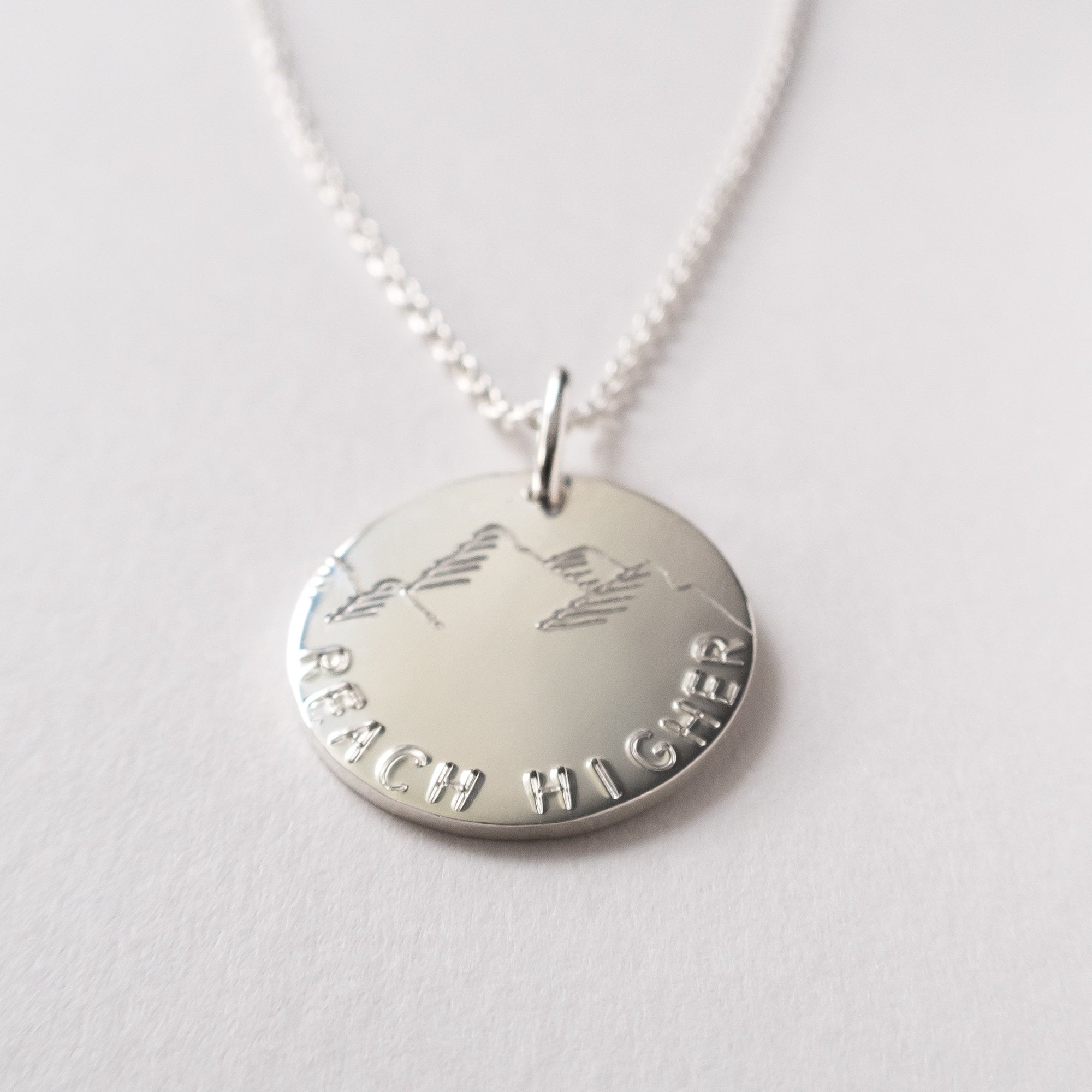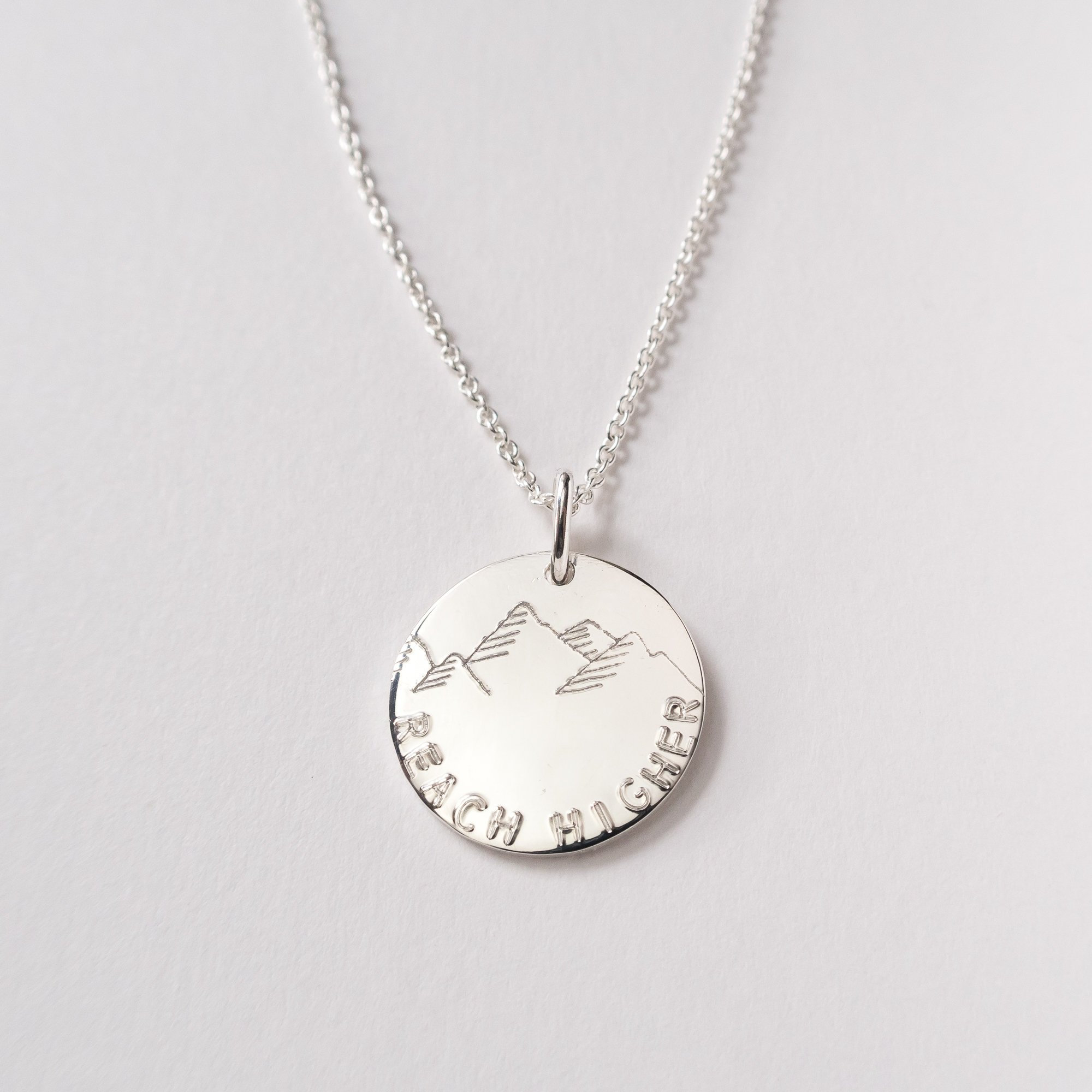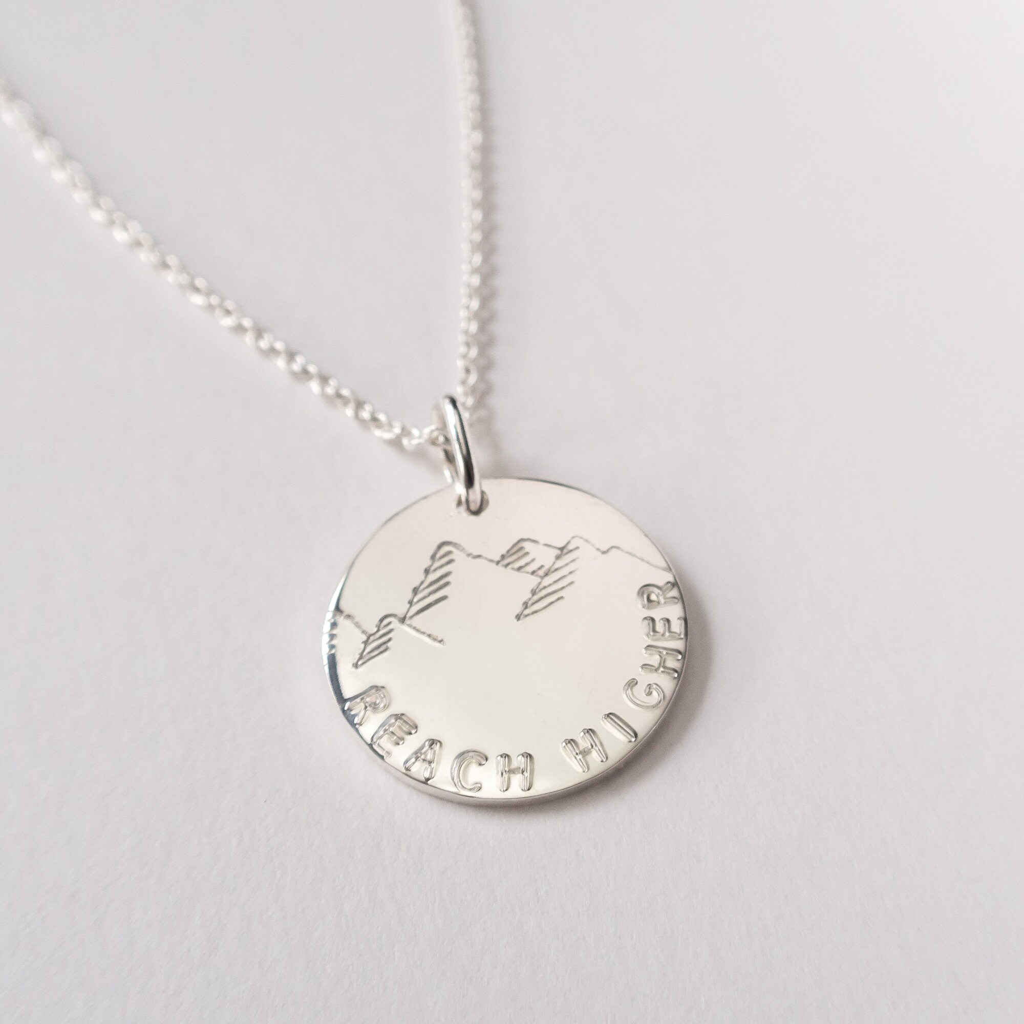 Sterling Silver Mountain Range Necklace Reach Higher Inspirational Words Jewelry Empowering Jewelry